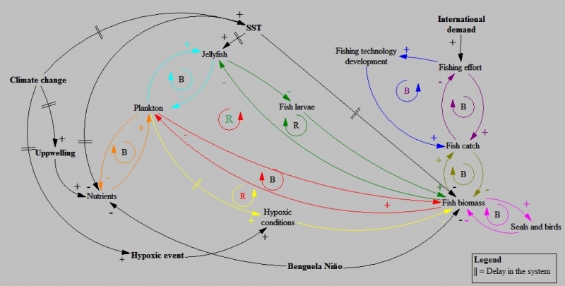 High fish biomass – pre-1990's Nutrient cycle (balancing, regional scale, well-established): The upwelling in the Northern Benguela current provides the region with cold, nutrient rich water that encourages the growth of plankton (i.e. zoo – and phytoplankton). The increase of plankton reduces the nutrient concentrations in the water column. This feedback mechanism keeps the concentrations of plankton and nutrients at moderate levels. (Bydén et al., 2003; Bakun et al., 2010)