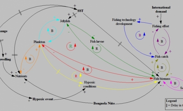 Plankton, hypoxic conditions and fish biomass (reinforcing, regional scale, well-established): Plankton (both phyto – and zooplankton) consumes oxygen. An increase of plankton creates hypoxic conditions if not preyed upon which in turn creates a hostile environment for fish larvae negatively impacting fish recruitment. This loop is reinforced given the fact that reduced fish biomass leads to an increase of plankton, which results in more severe hypoxic conditions (Bakun et al., 2010).